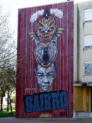 street art em Portugal e no Mundo, sendo já a maior galeria de arte urbana a céu aberto da Europa. Ocorrem visitas guiadas com periodicidade mensal, apresentadas por quatro jovens moradores do bairro e o número de visitantes tem crescido ao longo do tempo. Ali há de tudo. As pinturas ultrapassam já a meia centena, nas fachadas e nas empenas dos prédios. O projecto tem obras de artistas portugueses e estrangeiros, e a iniciativa acabou por constituir uma nova forma de olhar o Bairro, juntando intervenção artística, requalificação e cidadania. Kali, um dos guias ... foi também o nosso cicerone durante as quase duas horas em que percorremos as ruas da