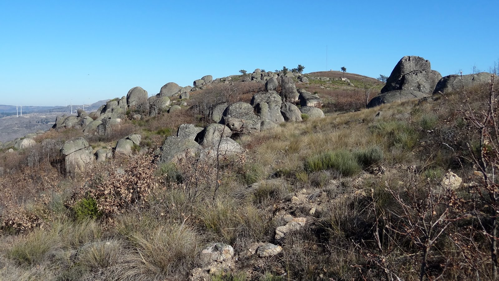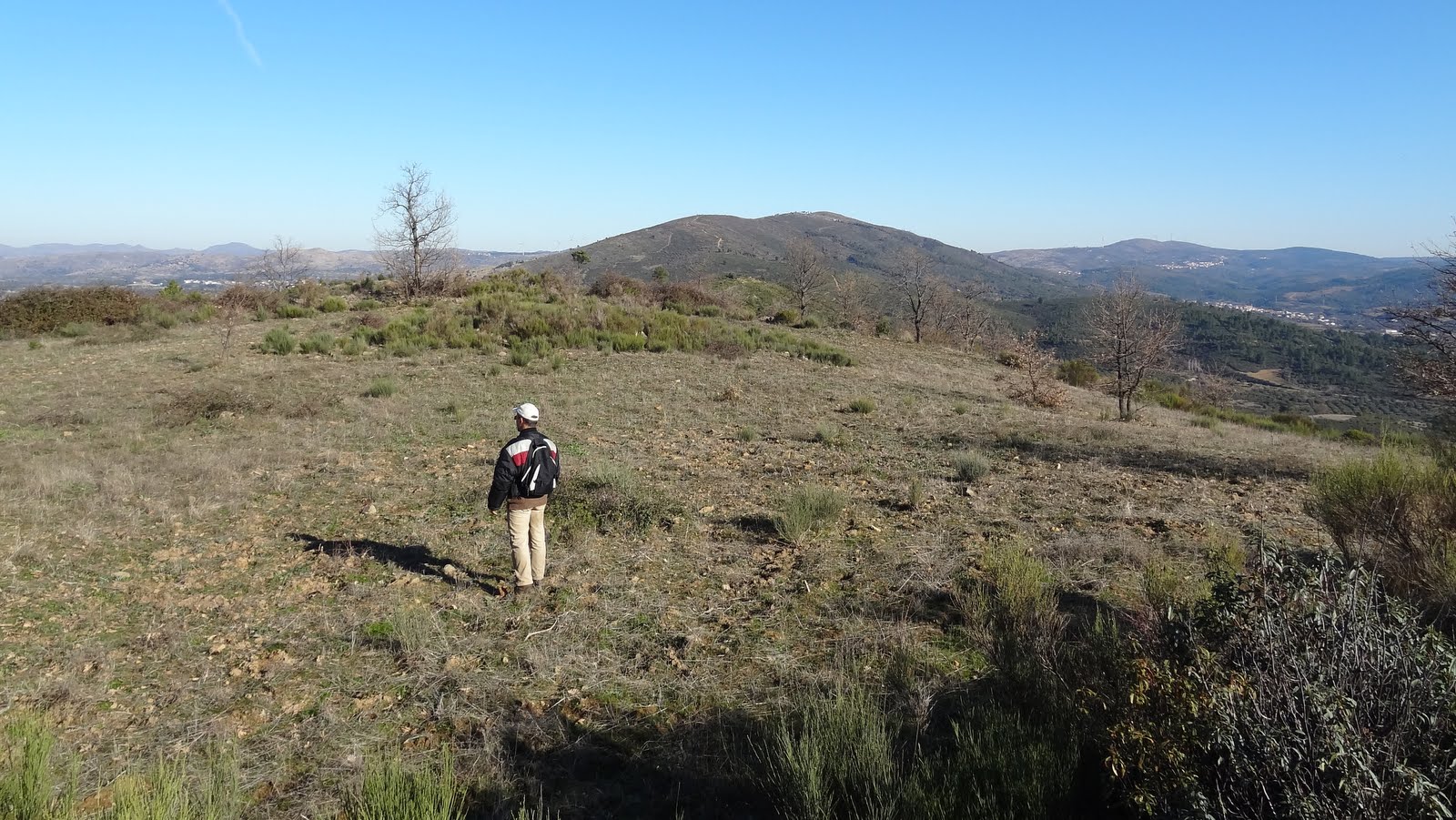Agora no sentido nordeste, a Opa obriga-nos a descer quase 100 metros ... para depois subir quase 300 até ao cume da serra. Mas à medida que avançamos a panorâmica vai-se abrindo 360º à volta. O vale da Senhora da Póvoa está agora aos meus pés, para lá dele as colinas onduladas da "minha"