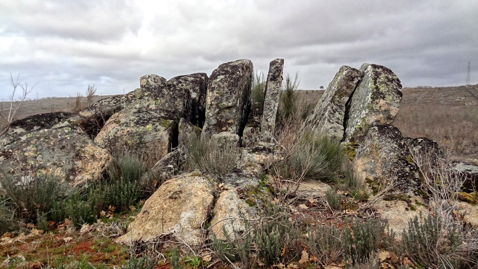 Vale de Espinho e do Soito. Já a rumar a sul, pelas onze e meia a promessa das nuvens escuras cumpriu-se, sob a forma de granizo que fazia doer na cara! Felizmente não durou muito, intervalava de quando em vez com boas abertas e até com algum Sol, enquanto eu avançava por entre os altares de pedra do "reino" dos