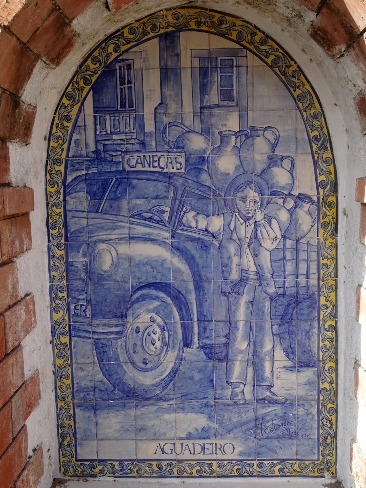 As águas de Caneças que não haviam sido encaminhadas para os aquedutos subsidiários do Aqueduto das Águas Livres foram encaminhadas para fontes, cuja exploração comercial se iniciou em 1910. Eram cinco essas Fontes de Caneças, das quais visitámos duas nesta jornada da Bobadela à Amadora: a Fonte dos Passarinhos e as Fontainhas. A primeira está infelizmente num certo abandono, votada ao esquecimento no interior de uma propriedade privada. A segunda, pelo contrário, está bem enquadrada num aprazível parque de merendas, patenteando orgulhosamente nove painéis de azulejos que ilustram as típicas actividades económicas ligadas à água, na aldeia saloia de Caneças.