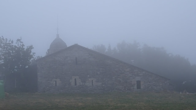 O Cebreiro. O calor contrastava agora com o frio de Maio, mas rapidamente a temperatura foi descendo ... à medida que foi subindo um nevoeiro que rapidamente cobriu os vales e a própria Igreja de